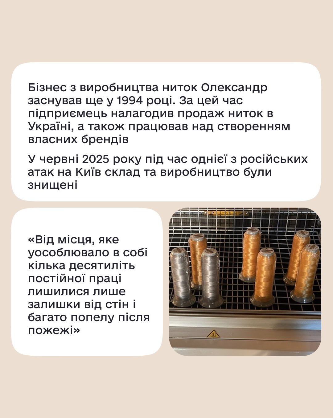 «Від місця, яке уособлювало в собі матеріальні й духовні здобутки кількох десятиліть постійної праці лишилися лише залишки від стін і багато попелу після пожежі», — розповідає Олександр Луць про втрату виробництва ниток під час російської атаки на Київ у червні 2025 року