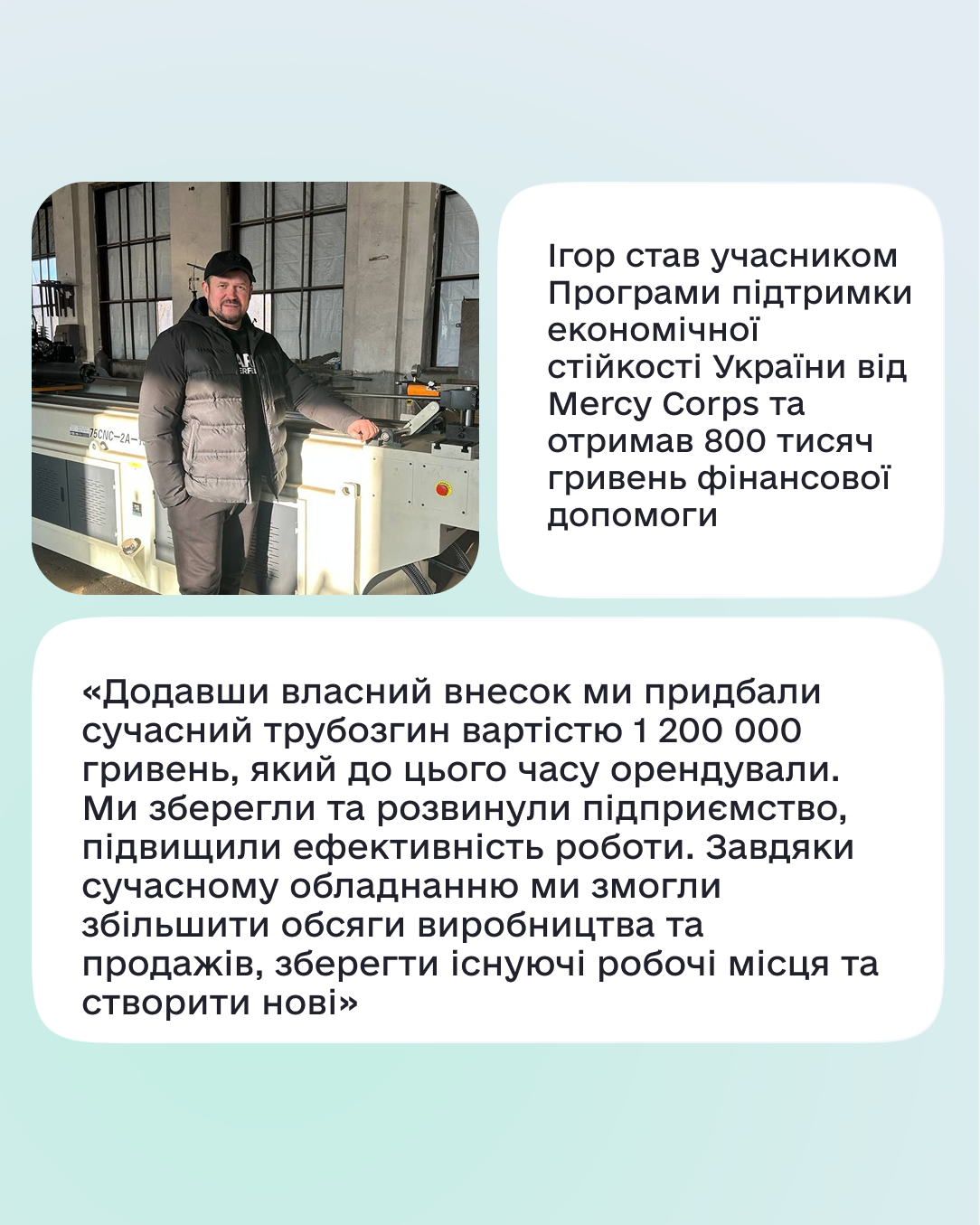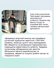 Завдяки участі у Програмі підтримки економічної стійкості України Ігор отримав 800 тисяч гривень фінансової підтримки. Разом із власним внеском у 400 тисяч гривень він придбав обладнання для згинання металевих труб