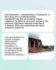 Підприємство «Імпекспромторг», яке виготовляє садові гойдалки та меблі зі штучного ротангу, працює вже понад 20 років. У березні 2022 року воно було повністю знищене внаслідок атаки — разом із обладнанням, матеріалами та готовою продукцією